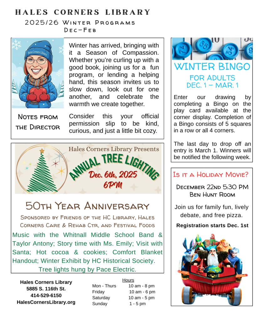 Dates of the Hales Corners Library Board of Trustees regular monthly meetings are listed below. Meetings are usually held on the fourth Thursday of the month, and start at 6:30 p.m. Meetings may be held virtually or in-person. Virtual meetings are noticed with a link to join the meeting and are recorded.